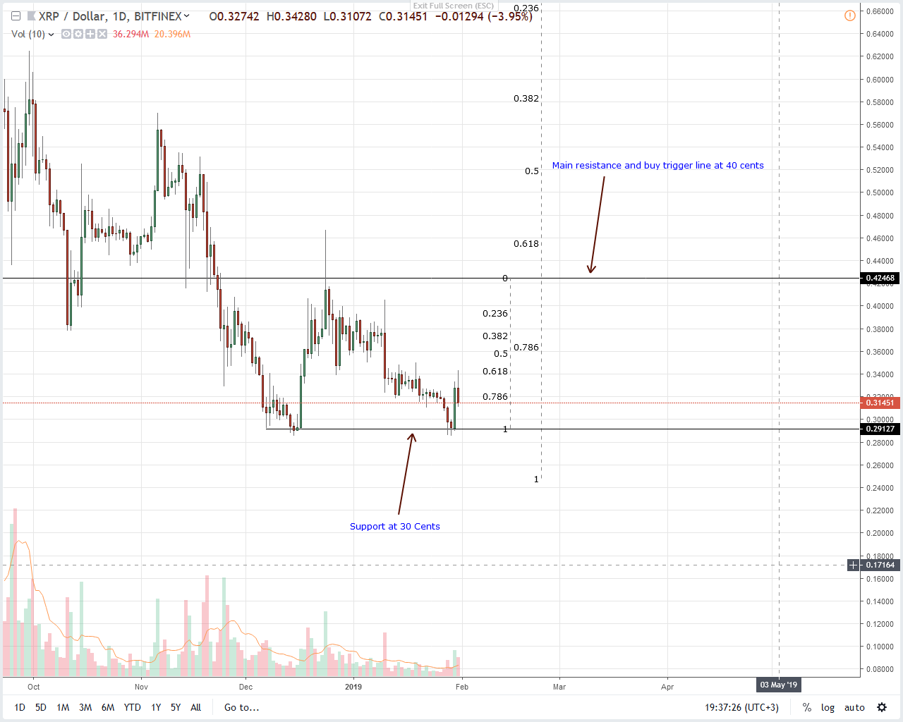 Like before, we shall trade in line with our previous XRP/USD trade plans. That means, before we recommend longs, there must be a full close above 34 cents. That’s not all. Confirmations that trigger risk-off long traders must have the support of high trade volumes. These volumes should preferably exceed recent averages of around 17 million.